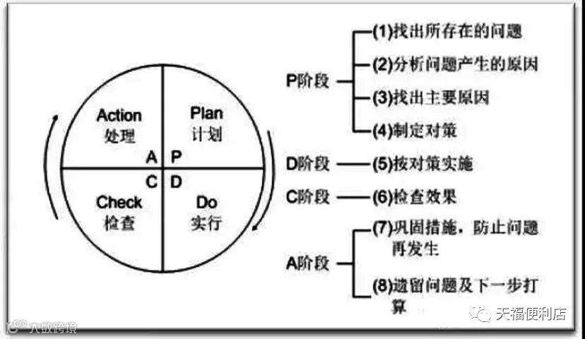 在工作中,我们需要先做计划;然后去实施计划;在实施的过程中发现问题,并分析具体原因,从而提出解决措施;最后再根据措施进行改进,并总结经验教训。