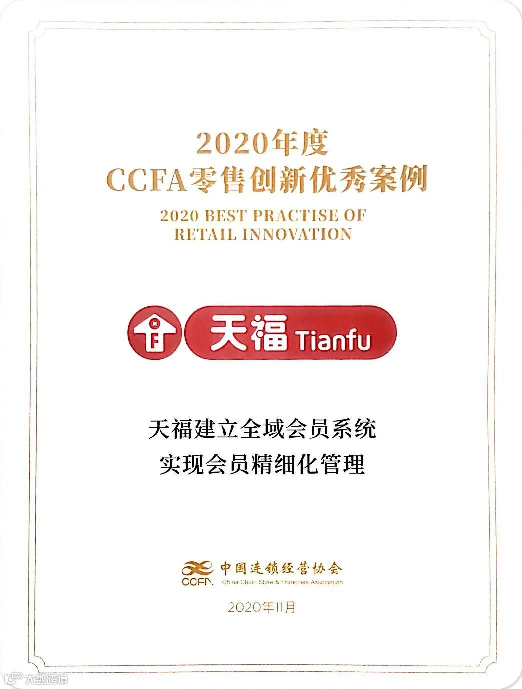 在中国连锁经营协会全零售大会上,天福以“建立全域会员系统实现会员精细化管理”,荣获2020年度CCFA零售创新优秀案例——最佳会员运营