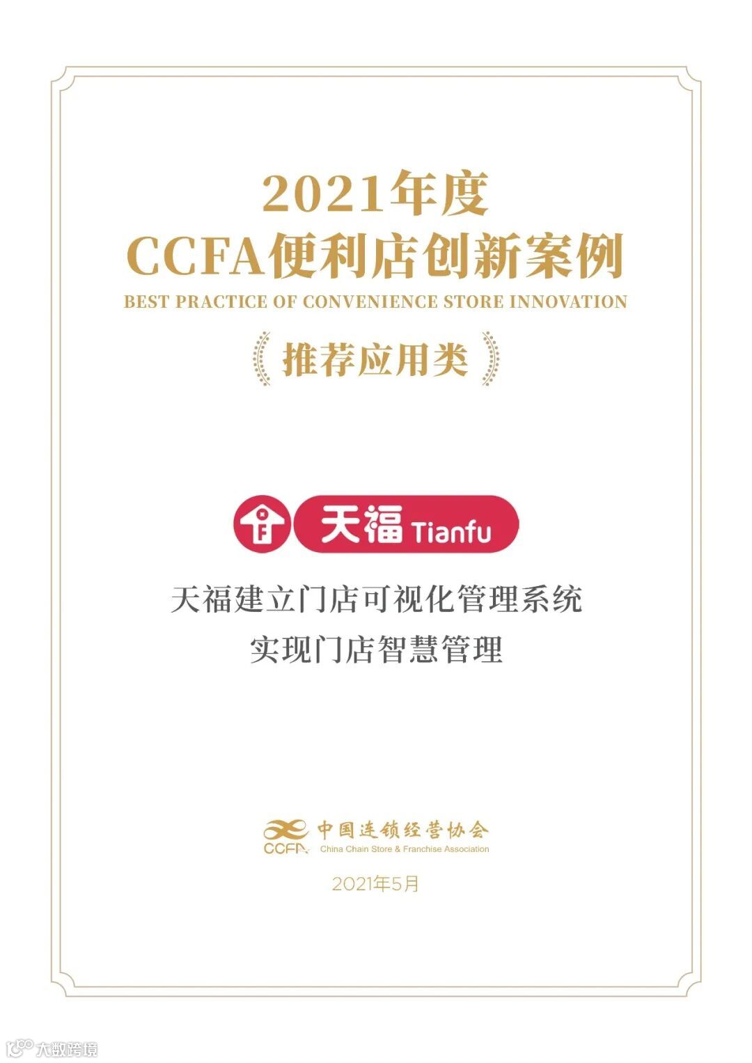 本次大会上,还公布了2021年度CCFA便利店优秀创新案例名单,天福以《建立门店可视化管理系统,实现门店智慧管理》入选,并被中国连锁经营协会评为“推荐应用”案例。
