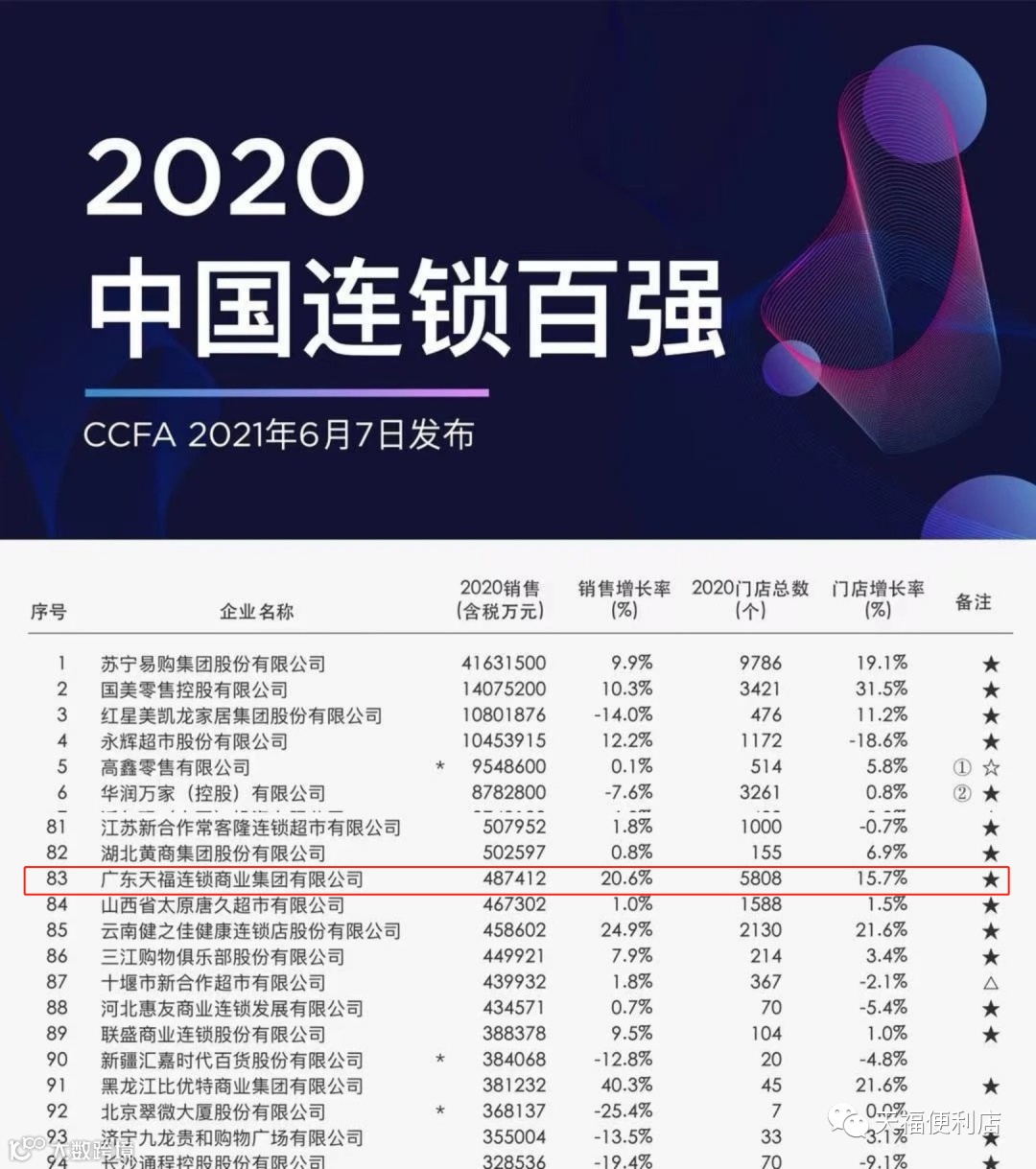 6月7日,中国连锁经营协会(CCFA)发布《2020年中国连锁百强榜单》,天福集团以48.74亿元的销售额,5808间的门店数量首度登榜,位列全国第83名。