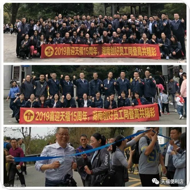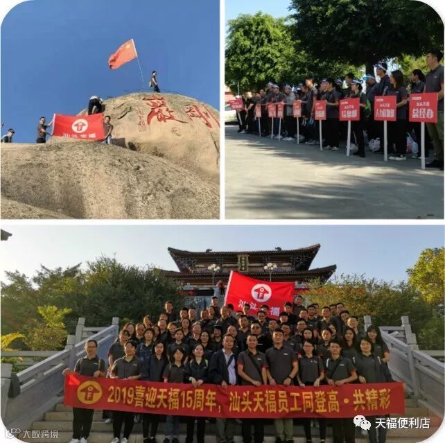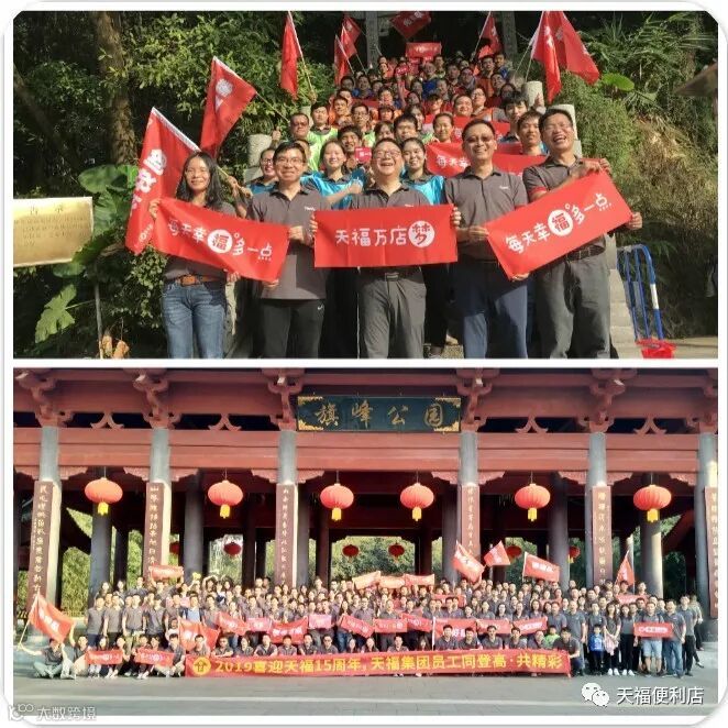 天福万店梦,我们一定行!”“天福15周年,生日快乐!”,齐声震天。天福红、“每天幸福多一点”品牌小旗和“同登高 共精彩”横幅和统一着装、神采奕奕的天福人,同时点缀着全国多地的名山大川,也成为景区里游人驻足艳羡的主角和风景。