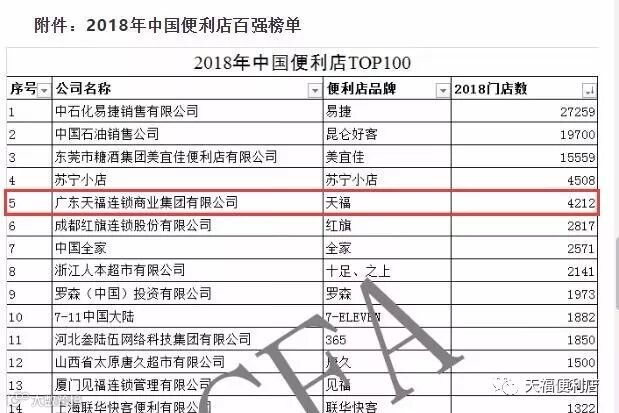 2.中国连锁经营协会发布了2018年中国便利店百强榜单,天福入围前五!