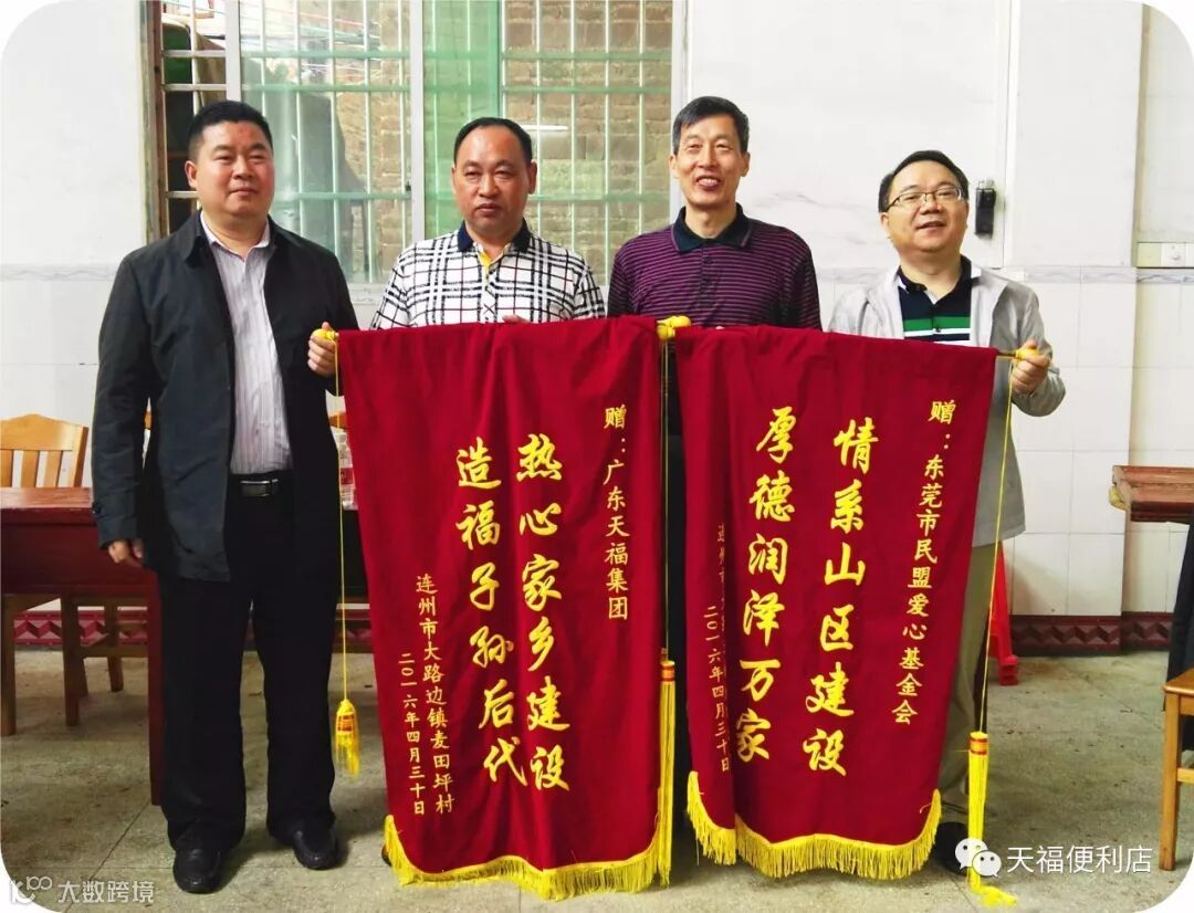 在公益的道路上,没有终点站,只有加油站。其实,天福的公益足迹从未停止,2016年,时任东莞市政协副主席、中国民主同盟东莞市委员会主委朱伍坤带领广东天福连锁商业集团有限公司等东莞企业,到连州市大路边镇进行爱心捐助活动,为该镇麦田坪村的“美丽乡村”建设捐助爱心款项,据悉,在此次爱心捐赠活动中,莞盟爱心基金为连州美丽乡村建设捐助了10万元人民币,天福集团也捐赠了68888元。