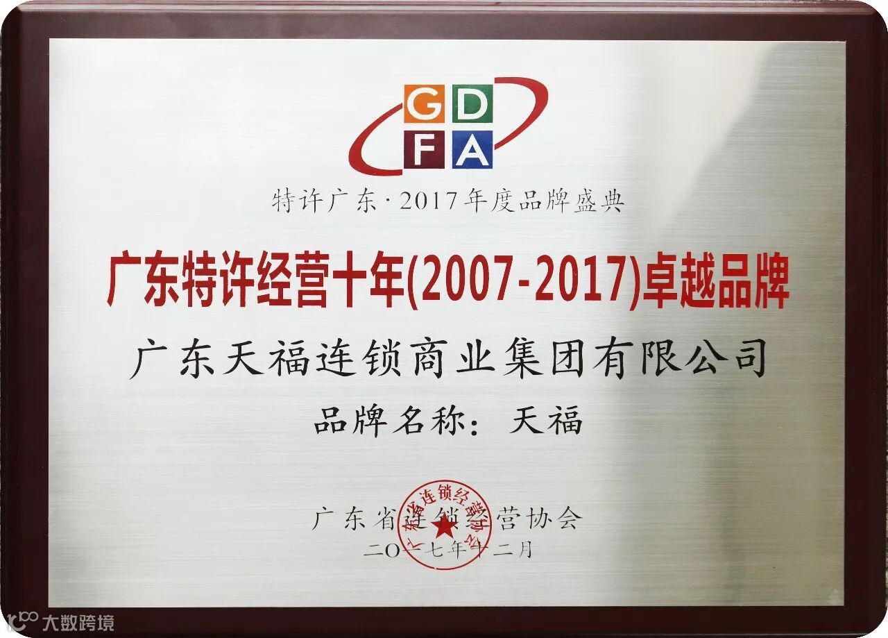 “天福”获得“广东特许经营十年(2007-2017)卓越品牌”