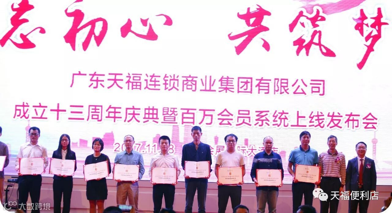 11月18日,广东天福连锁商业集团有限公司在东莞会展国际酒店举行“天福十三周年庆典晚宴暨百万会员系统上线发布会”。东莞市政协副主席程发良、广东省连锁经营协会专职副会长张小琳、秘书长樊飞飞、东莞市零售行业协会会长梁仲华等领导嘉宾,以及天福集团公司领导员工、供应商、门店代表、媒体记者等900多人出席了本次活动。