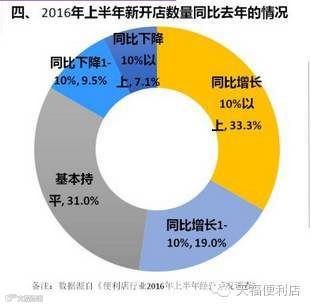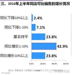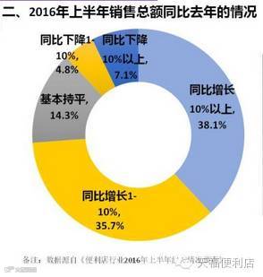 从调研可知,便利店2016年上半年的销售总额同比去年持平的占14.3%,同比增长10%以上的占38.1%,同比增长1-10%的占35.7%,这两项占了大部分,可知2016年上半年便利店的销售总额比去年要有所增长。