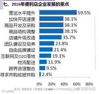 据悉,2016年便利店企业发展的重点主要集中在营运水平提升、加快开店速度、商品开发及采购、商品结构调整、店铺升级改造上。