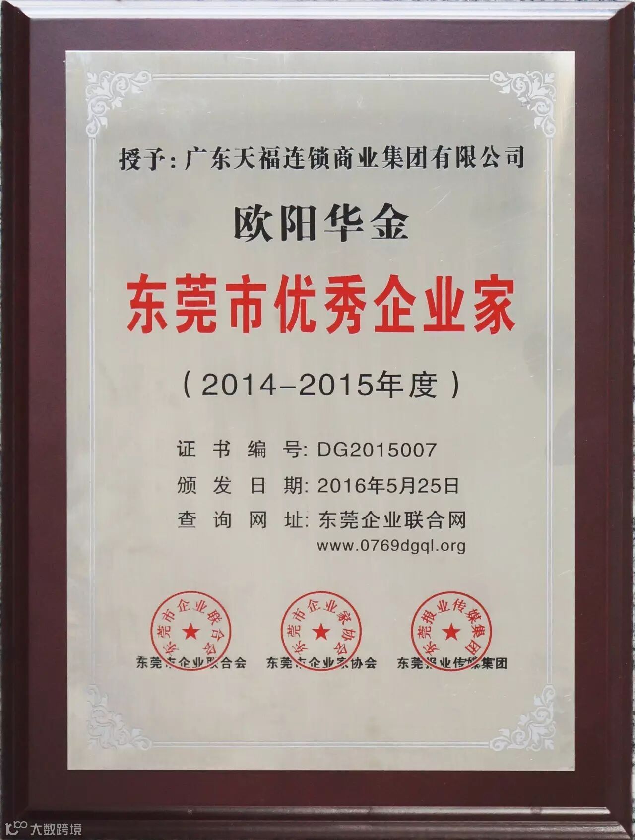 5月25日,东莞市企业家联合会、东莞市企业家协会第三届理事会第二次会员代表大会、2014-2015年度优秀企业、优秀企业家表彰大会暨东莞市企业家活动日在东莞市国际会展酒店举行,广东天福连锁商业集团有限公司董事长欧阳华金当选东莞市企业联合会、东莞市企业家协会常务副会长,并被评为“东莞市优秀企业家”。