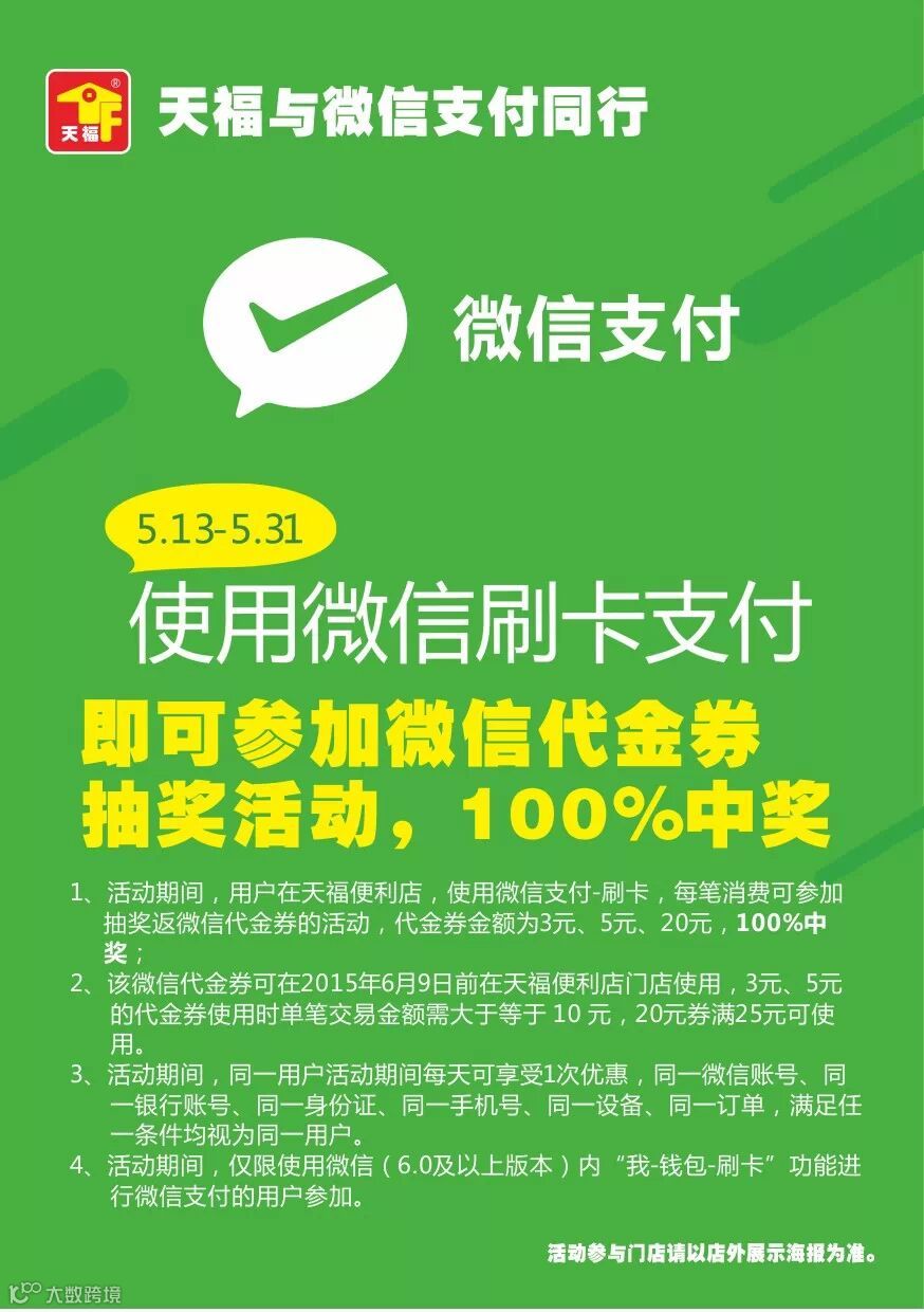 ①活动期间,在张贴海报天福门店,使用微信-刷卡支付,单个用户每一天成功进行第一笔微信支付后可享受参加返代金券优惠活动(对消费金额无要求),100%返劵,代金券金额为3元、5元、20元;