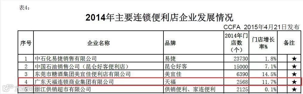 中国连锁经营协会“2014年度行业发展状况调查”日前结束,“2014中国连锁百强”及相关榜单于2015年4月21日发布。《2014年主要连锁便利店企业发展情况》 榜单显示,“天福”品牌便利店门店数量名列全国第四,与去年相比持平。数量排名第一的是中石化的“易捷”便利店。
