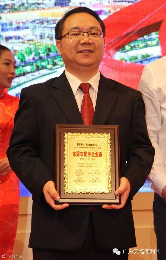 广东天福连锁商业有限公司是一家以连锁便利店经营为主、集生鲜超市管理、物流配送、农业投资、电子商务及商业地产为一体的集团企业。天福集团的掌舵人欧阳华金董事长在继获得2012年度“东莞市优秀企业家”后,今年再度获得 2013年度优秀企业家殊荣,这既是社会各界对他个人的肯定,同时也是寄望这些优秀企业家,努力建设和发展,做好,做大,做强的企业,争取更上一层楼。