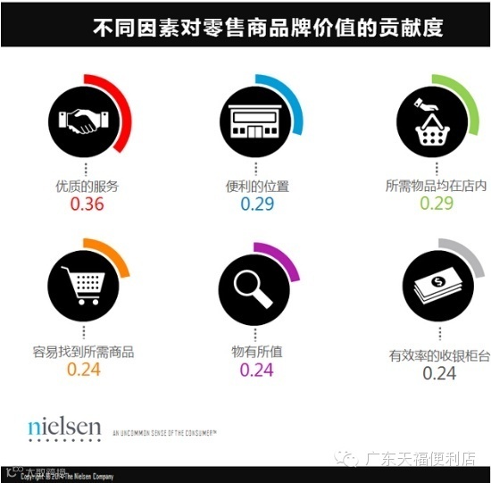 尼尔森调查显示,“便利的位置”对于零售商品牌价值的贡献度紧随“优质的服务”之后,位居第二。其次是“可以很容易、并很快找到我需要的东西”,“能在一个门店找到我想要的所有东西”、及“有效率的收银柜台”。值得一提的是,能够提供“所需物品均在店内”服务的零售店的排名从前一年的第13位一跃成为排名第4的品牌价值影响要素,与此同时,“有效率的收银柜台”也从去年的第15名跃居为如今的第6名。
