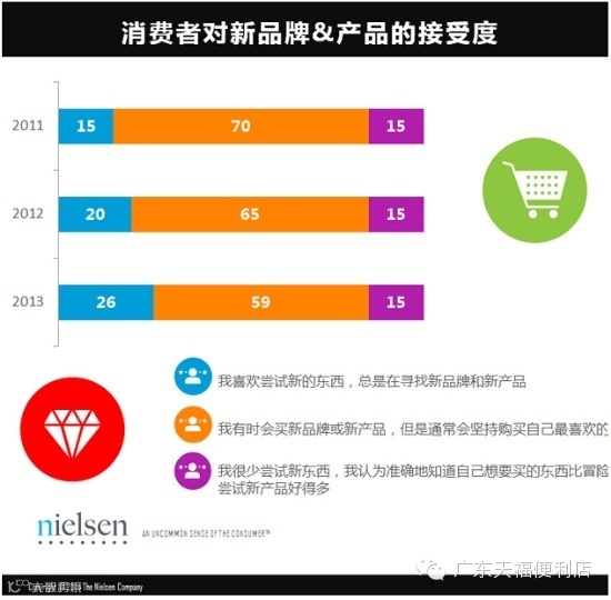 与此同时,尼尔森的研究显示,在过去三年里愿意尝试新品牌或新产品的消费者也在增加,从前一年的15%跃升至如今的26%。与此同时,偶尔尝试新品牌新产品但通常更倾向于自己喜爱的品牌的这一类消费者比例则从过去的70%下降到今年的59%。