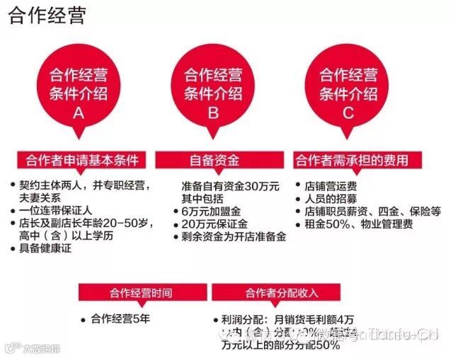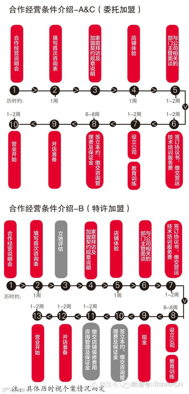 “全家”合作经营的模式有A、B、C三种,“全家”将A、C模式称作“委托加盟”,将B模式称作“特许加盟”。在对“全家”的访谈中,朱总强调,无论A、B、C哪种类型,店铺所有权均是“全家”的,加盟商只获得了经营权。不同的合作模式合作者(加盟商)的投资不同,分红比例也不同。这个模式来源于“全家”曾经与7-11的合作。而7-11在全球的特许经营就是这个模式。从上面“全家”官网截图看,特许加盟模式比委托加盟模式合作者多承担的费用是“店铺装修费”。