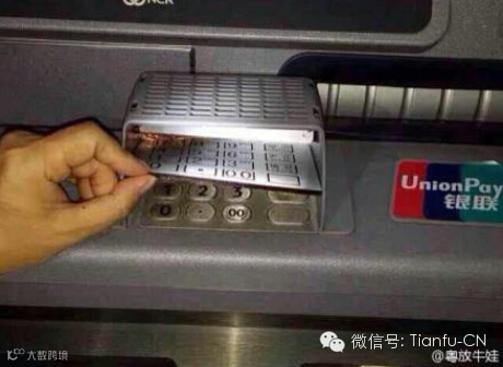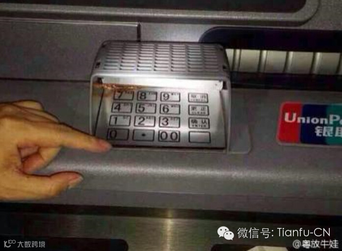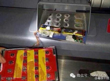 7月11日,网友“粤放牛娃”在微博上发布了一组图片引起广泛注。图片中,柜员机按密码的键盘上出现了一个与键盘一样的套。套的背面有数据线和电路板。“粤放牛娃”附加解释说,除了键盘套外,犯罪分子还在插卡口上加入了读卡器。取钱者将卡插入后,读卡器窃取卡内信息,输入密码时,键盘套再记录密码。得到两组数据后,犯罪分子就可以复制另一张卡将卡内资金盗走。