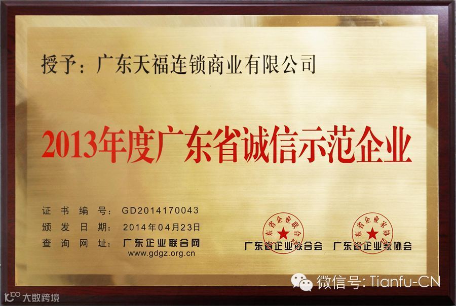 广东天福连锁商业有限公司此次获得“2013年度广东省诚信示范企业”称号,是“天福”品牌在全省知名度和美誉度的一个有力见证,也是继“2013年度第十八届广东优秀门店”广东天福获得的又一殊荣。