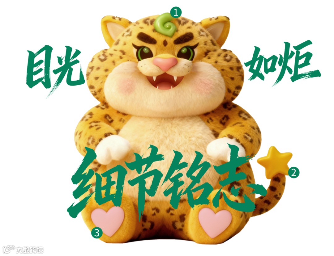承袭华北豹尊贵的金色底毛与标志性金钱斑纹,并于关键视觉节点巧妙融汇企业品牌色,实现IP个性与品牌基因的深度绑定。
