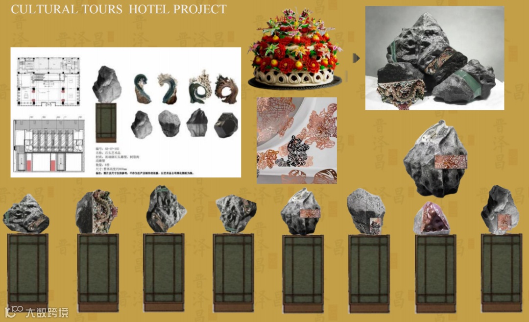 宴会区一层晋德厅,八件《晋韵石雕》艺术品静静伫立,演绎着传统技艺的新生。传统面塑的立体饱满与剪纸的纤巧细腻,在坚硬石材上焕发生机。