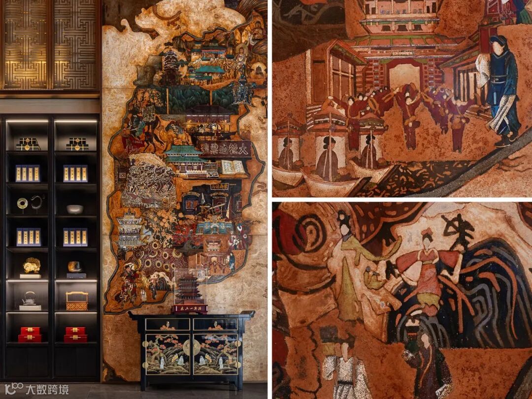 前厅的《锦绣晋境》巨幅推光漆画,以山西地图为骨架,将五千年文明看山西的代表元素熔铸一炉。画中,晋剧伶人的水袖翩然,威风锣鼓的鼓槌飞扬,社火队伍的热闹喧腾……