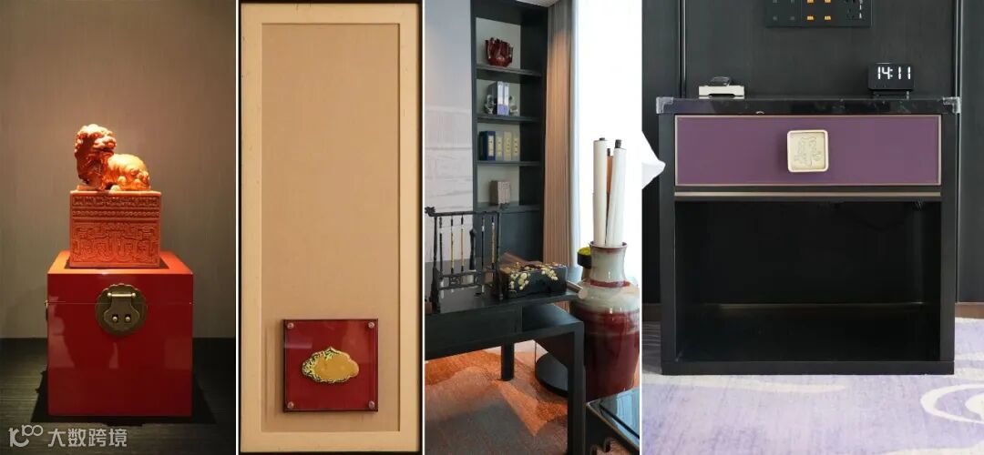 客房内部,文房四宝、推光漆器、晋商印信点缀书房,床头则以家族姓氏为饰,细节之处尽显文化匠心。整体装饰将晋商浓墨重彩的审美,以淡雅笔触融入现代设计,兼顾传统韵味与当代舒适。