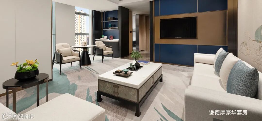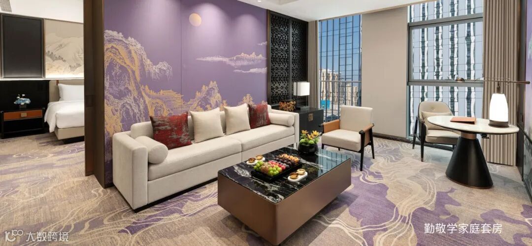 每一层电梯厅均设有对应大院的俯瞰图木雕,以细腻刀工再现院落格局。客房门口饰以“如意”造型,寓意吉祥平安;走廊墙面镌刻八大家族的商风家训,传递诚信立本、勤俭传家的精神内核。