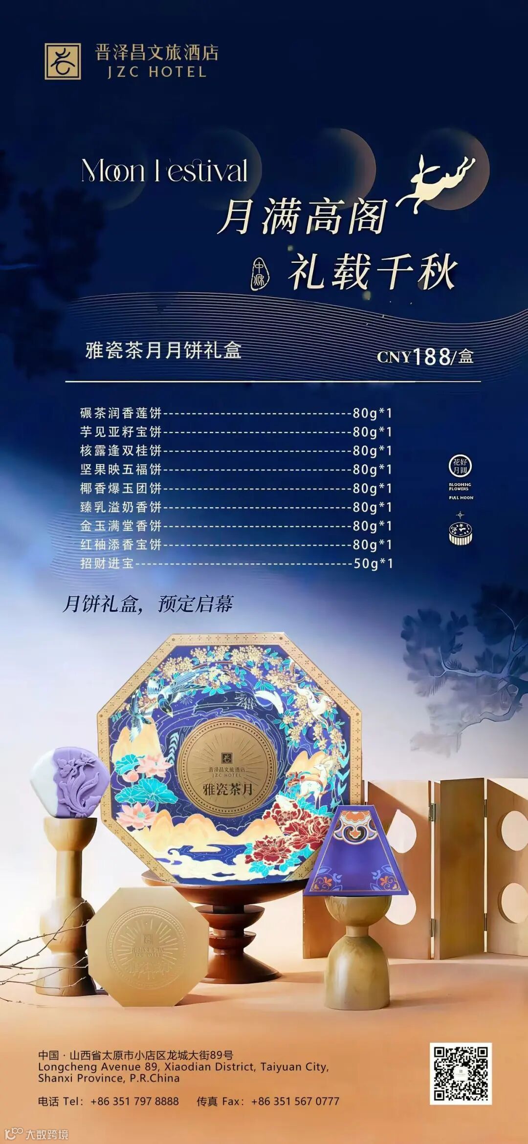中秋将至,晋泽昌文旅酒店倾情推出“雅瓷茶月”月饼礼盒,以东方美学传递团圆之意。礼盒取蓝釉瓷韵,绘花鸟山水,形若八角宫灯,承传统匠意。内蕴九味臻品月饼,碾茶莲香清雅、芋见亚籽绵密、核露逢双醇润…每一枚皆匠心手制,风味与诗意交融。