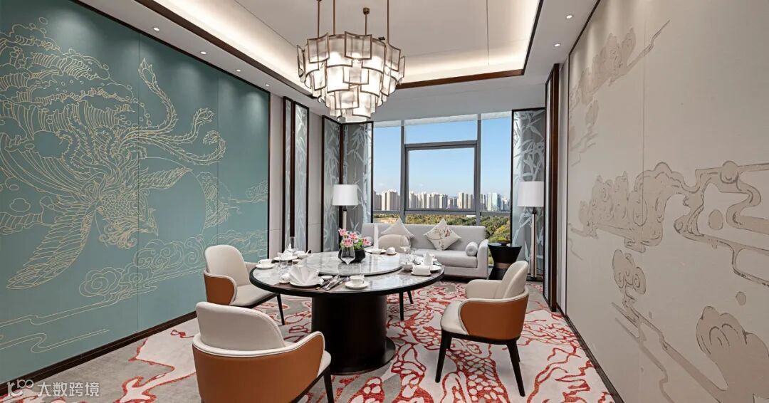 移步晋御轩中餐厅,飞天厅让精卫填海传说焕新。墙面艺术画将精卫衔石的坚毅,与云冈飞天的灵动融合:飞天衣袂翩跹伴精卫穿山海,精卫振翅衔石显不屈。两种文化符号相映,藏神话悲壮之美与石窟艺术精髓,让用餐空间多了“向韧而生”的哲思。