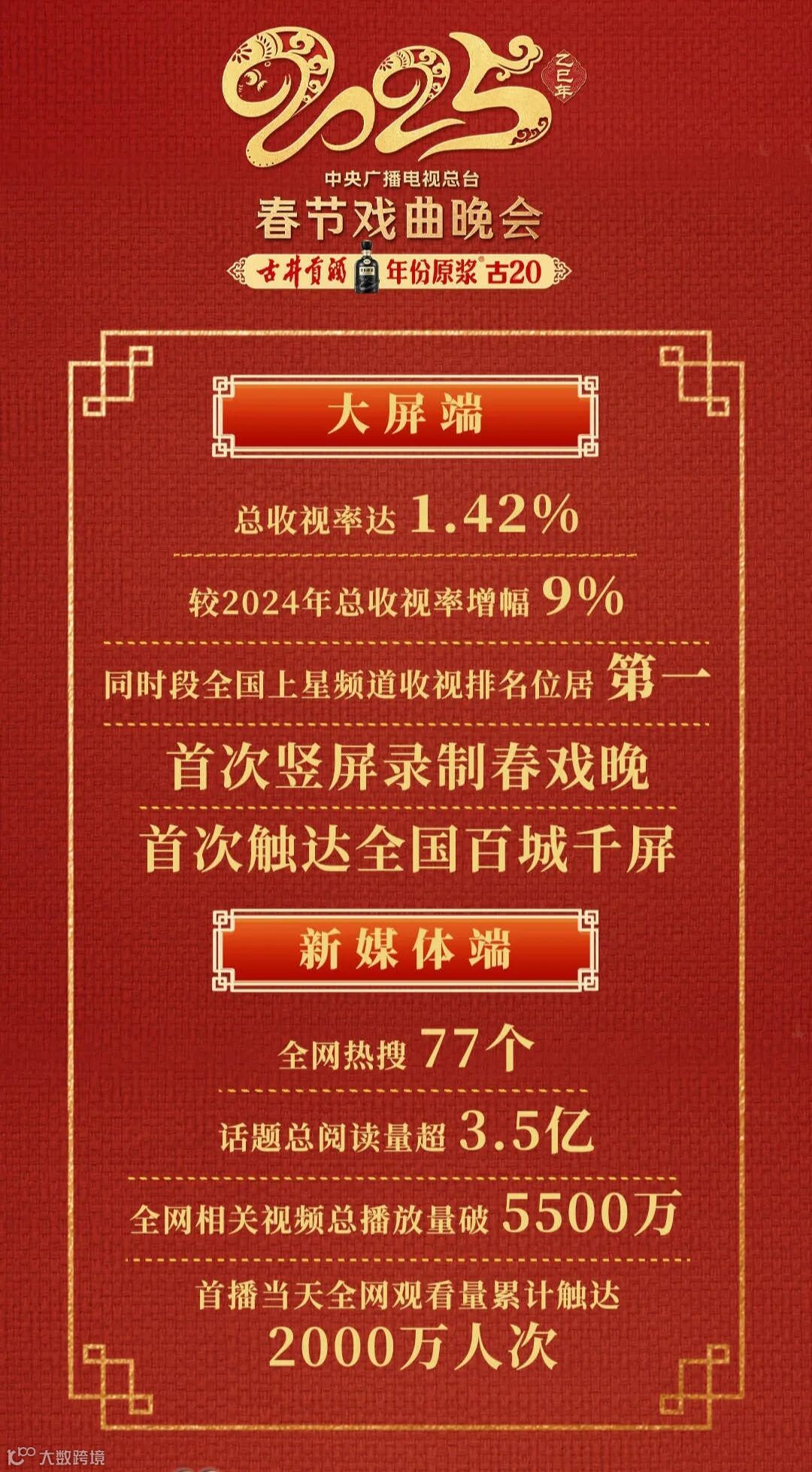 晚会播出总收视率达1.42%,率较去年增幅9%,收视份额较去年增幅17%,在全国同时段晚会类节目收视排名第一,累计触达超2000万人次,话题总阅读量超3.5亿,成为春节期间最受瞩目的文化盛宴之一。