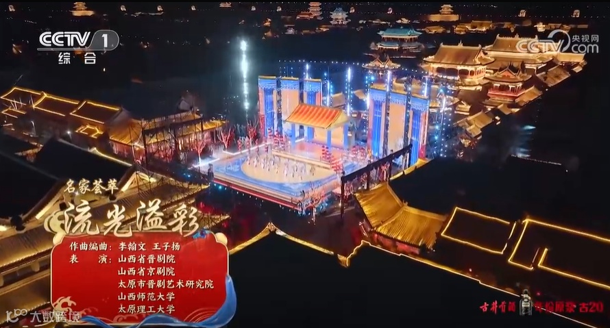 戏曲晚会的主会场通过“借景”,在太原古县城“城池凤翔余”的建筑格局之上,构建出“戏在楼台间,一步一戏眼”的清新隽永主舞台,并利用无人机航拍、外景街区秀等形式,将舞台延展并深入太原市井烟火之中。