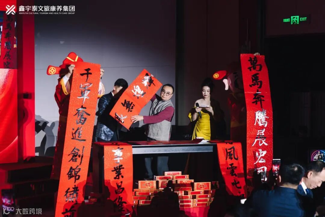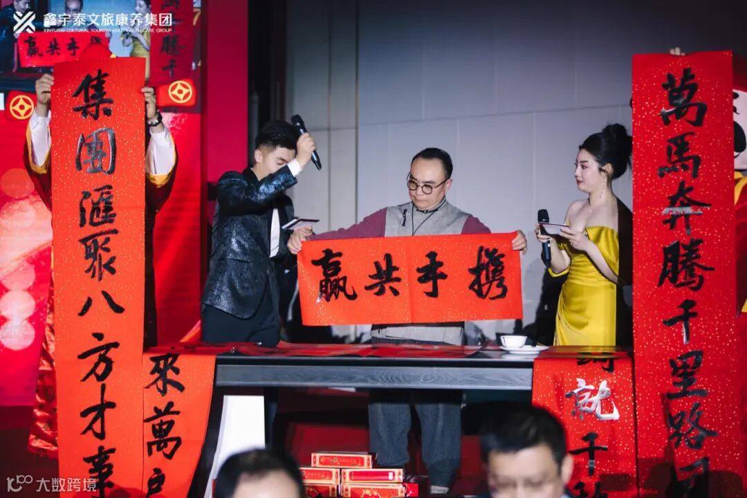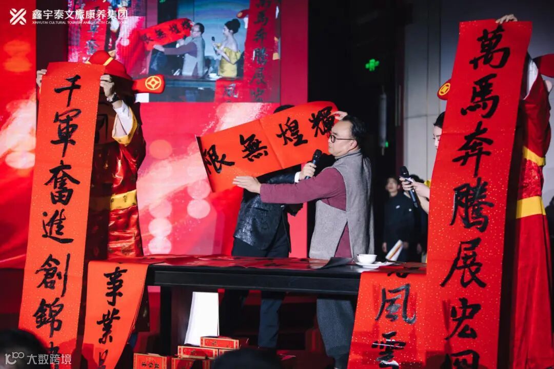 新年晚宴特别设置了楹联送祝福环节,三个篇章分别以楹联为引,层层递进,特别邀请到山西省书画家协会副秘书长、中国匾额研究协会副理事长梁志文先生现场挥毫泼墨,为万马集团、鑫飞集团、鑫宇泰集团送出对新年的美好祝愿。