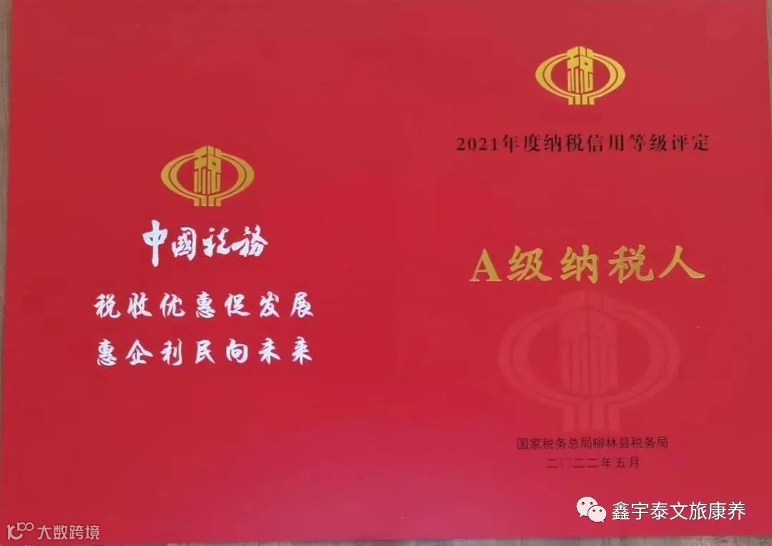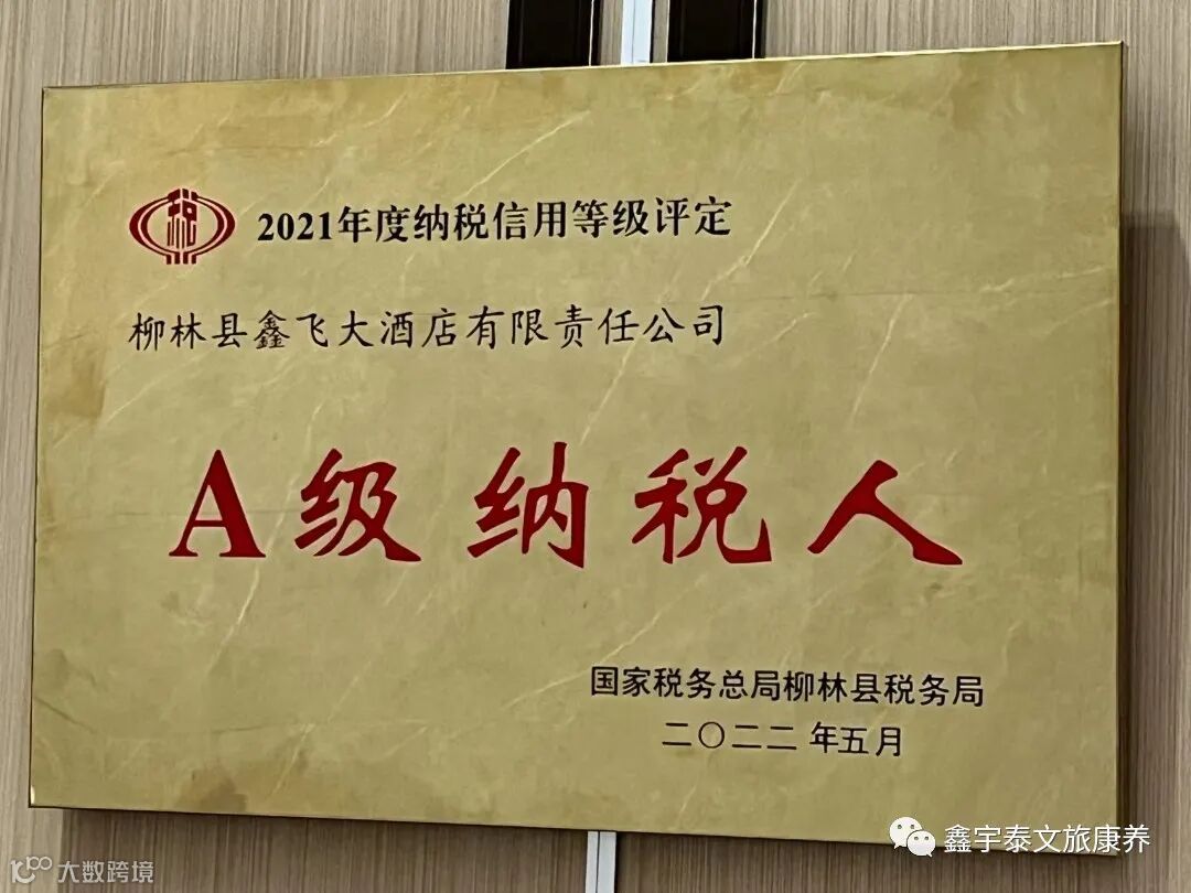 鑫宇泰文旅康养集团子公司:柳林县鑫飞大酒店有限责任公司荣获A级纳税人荣誉。
