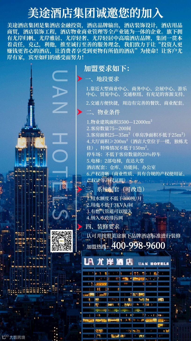 美途酒店集团长久立足于:酒店金融投资,酒店品牌输出,酒店装饰设计,酒店用品商贸,酒店装饰工程,酒店物业商业管理等板块。美途酒店集团利用雄厚的自有资金及完善的金融体系,完善的供应链体系,完好的酒店管理体系,近来年,合作和帮扶了数十个酒店知名品牌,目前为止投资余额高达数十亿元!旗下拥有尤岸,舒致,璞漫,诺布丽斯,尤岸归帆等数十个中高端酒店品牌,研堂装饰设计,美途集采商贸,林铭科技装饰工程,美途尤岸商业管理和中凤文投金融投资等其他板块品牌,致力于最终实现“让天下不再有难做的酒店”为使命!让客户尤岸有家,宾至如归的感受而努力!