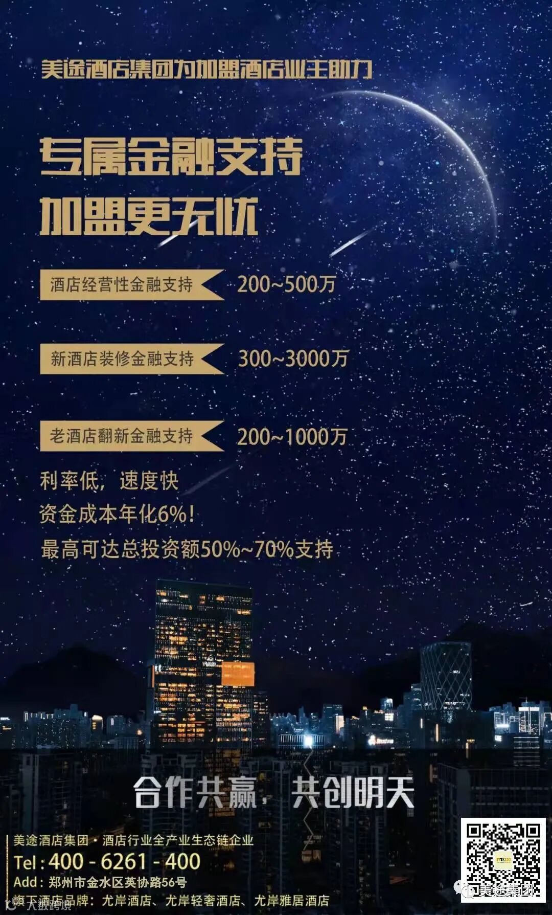 为此美途酒店集团特推出“高额度、低利率”的金融服务,旨在帮助酒店加盟伙伴缓解资金压力,提供老店翻新、新店装修、服务升级等经营所需资金的支持,为您提供额度最高300-2000万元,月利0.5%,贷款服务,让酒店升级不再受困于“周转困难”。