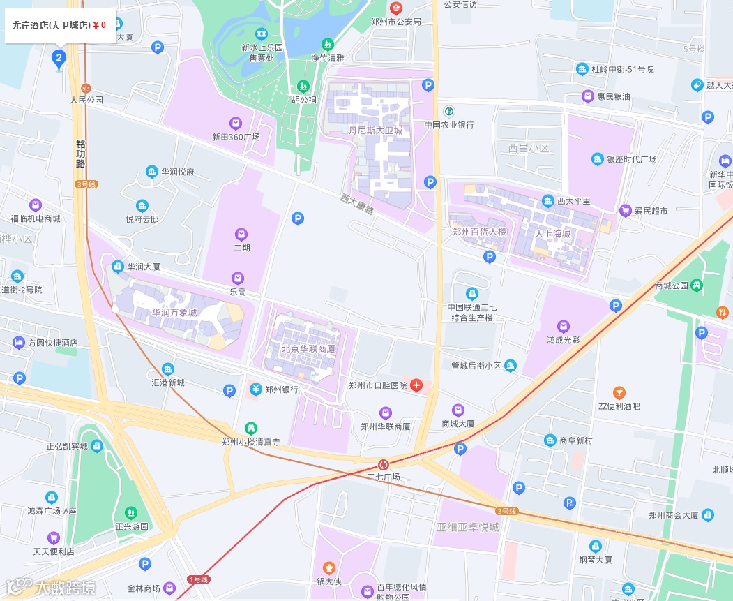 酒店位于郑州市中心商圈的铭功路与太康路交叉口位置,周边大卫城 万象城 新田360广场等大型购物商城,地处市中心最繁华地段,其所属的二七路商圈以二七塔为中心向四周辐射,加上火车站、汽车中心站环嗣左右,该商圈日均客流过百万。周边交通便利,数十路公交巴士联通全城,地铁1#、3#线交汇于此,强大的人流吸附效应凸显出其无与伦比的区位优势。酒店北向紧靠人民公园,景色怡人,东南面毗邻二七纪念塔,亦为地块注入浓浓的人文气息。周边环境优美,交通发达,是您旅行、出差的绝佳栖息地。