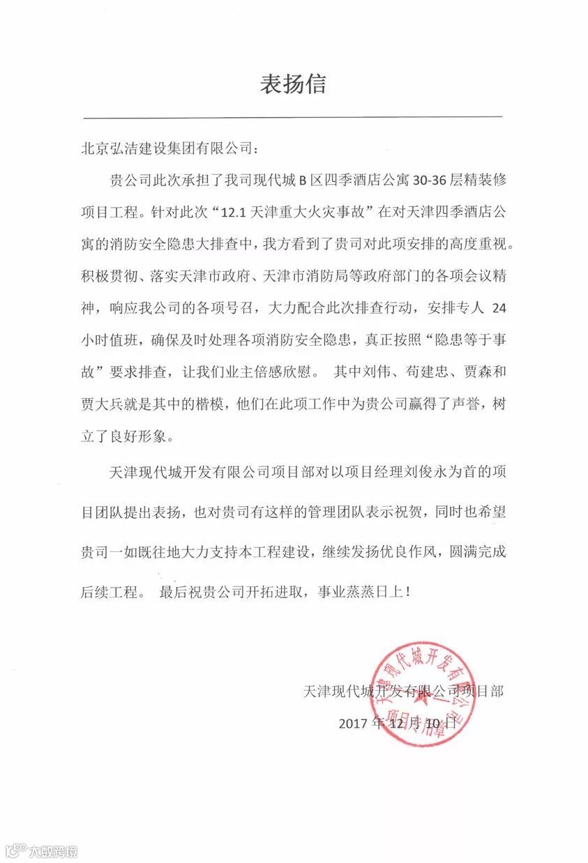 弘洁实业控股集团日前,我公司收到业主单位天津现代城开发有限公司项目部送来的表扬信,以表彰我公司在该单位中标的项目施工过程中,对“消防安全隐患大排查”做出的高度重视。