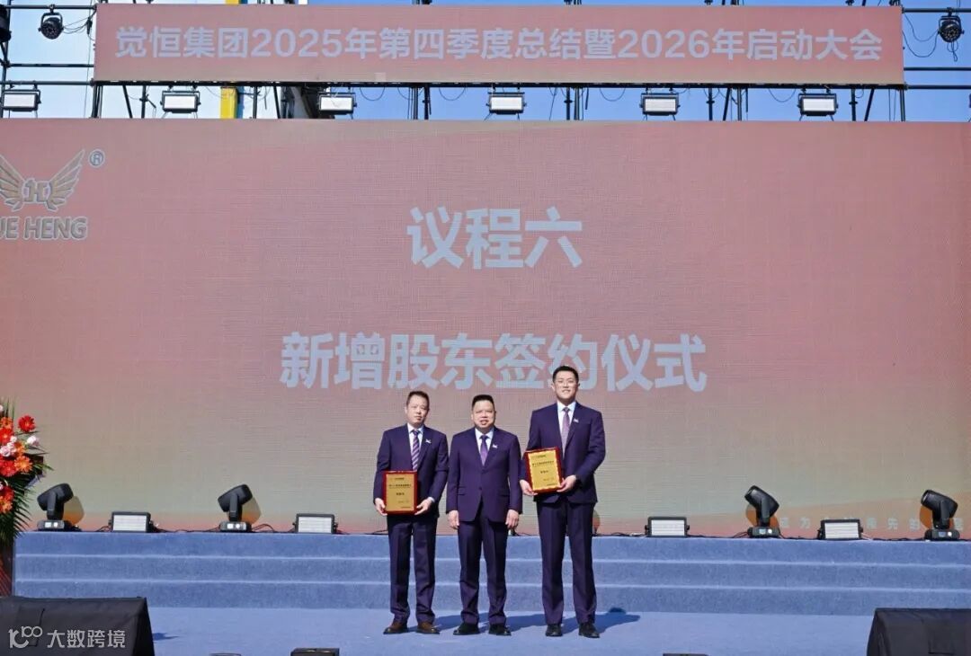 第十七事业部总经理林俊志、第十八事业部总经理贺新华签署实股协议,正式成为集团股东。林总现场分享感言:"今日为觉恒添砖加瓦,明日共创百亿版图。"