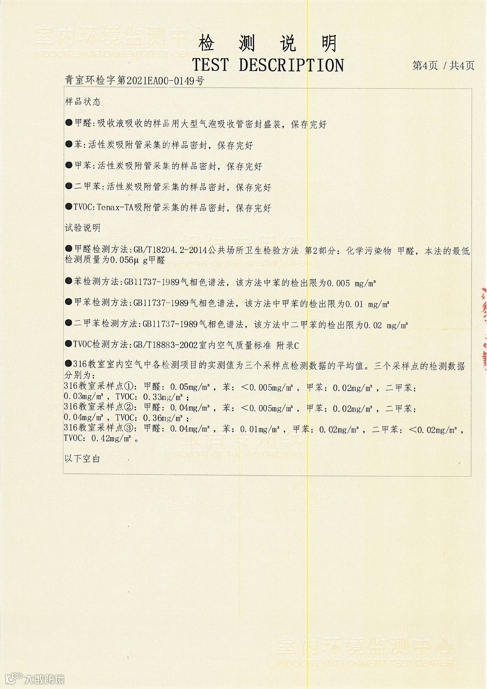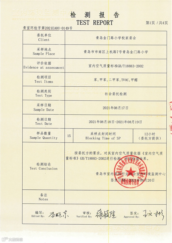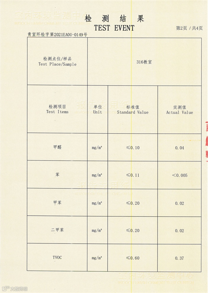 8月20日,第三方检测机构出具检测报告,新校教室空气质量检测的各项指标全部合格 。