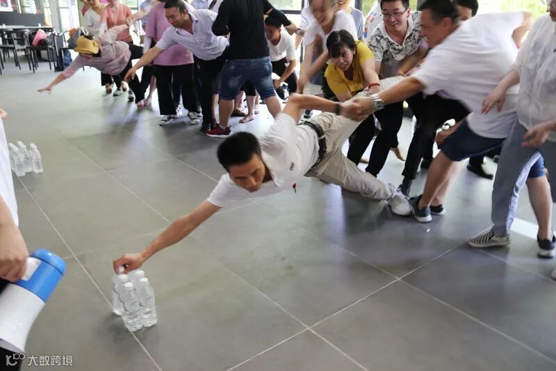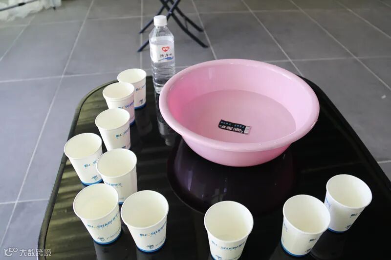 1. 画一条线,矿泉水放在线外1.4米、1.7米的距离,学员不得超过线,并且不得借助外物,只能团队协助;