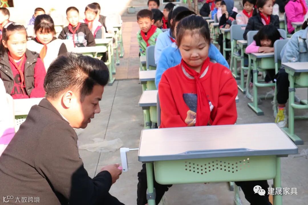 现场向学生和老师展示手摇升降课桌的调节方式