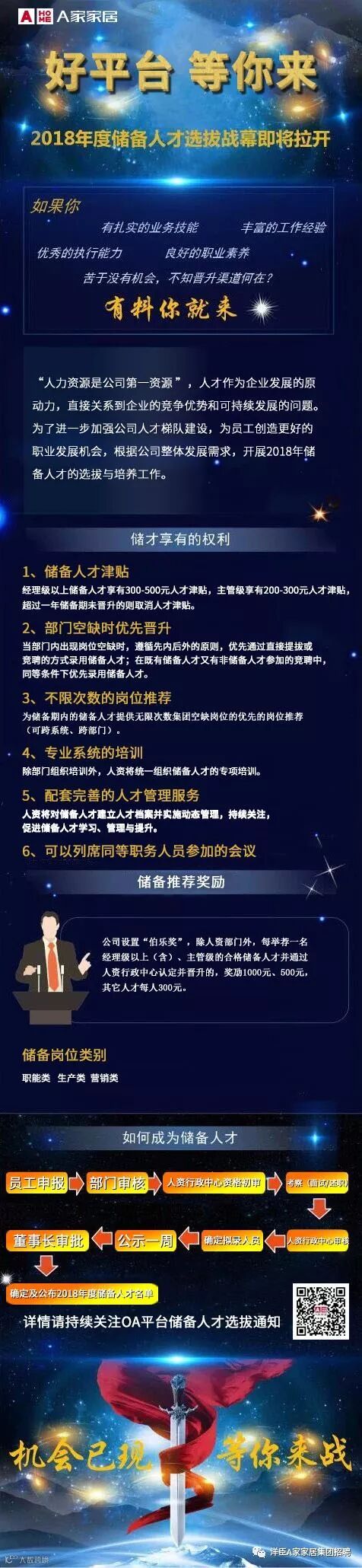 导读:好平台,等你来——A家家居2018年度储备人才选拔战幕即将拉开