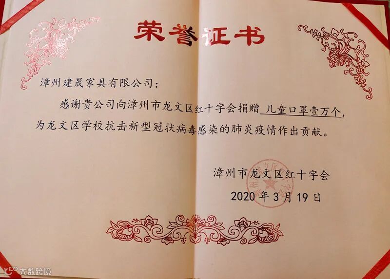 漳州市龙文区红十字会为漳州建晟家具有限公司颁发荣誉证书