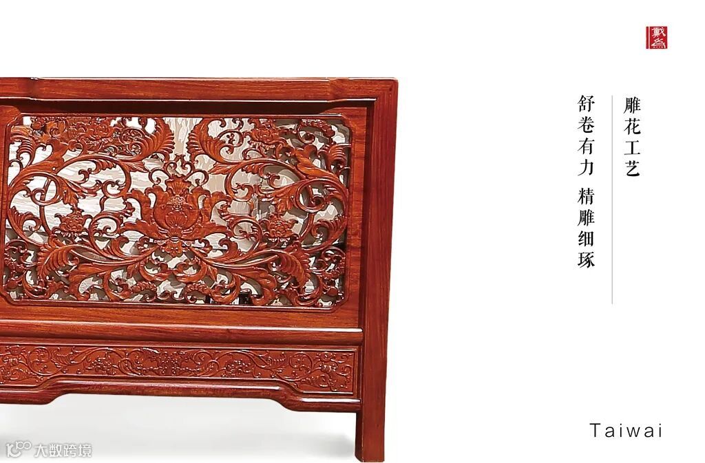 一套以西番莲卷草纹为设计主题的红木套房,当阳光照射在门板上折射出木材的天然纹理,丰富优美,那些肌理也随着光线的移动,呈现不一样的质感。