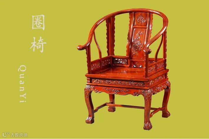 圈椅,上圆下方,外圆内方;圆背连着扶手,从高到低一顺而下;靠背板呈C或者S形曲线。圆婉优美又不失雅致,体态劲健且富有力度感。