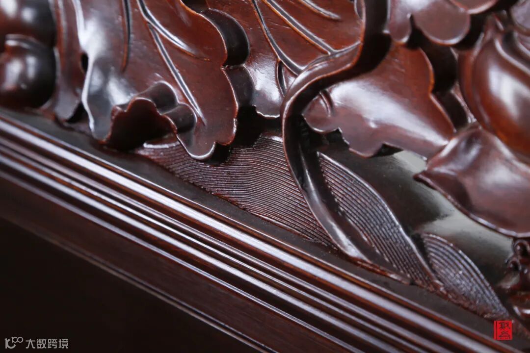 扶手侧面和台面可见大幅的留白处理,细腻的阳刻线条则是干净的点缀,这些细密的线条也更加考验师傅的耐心。