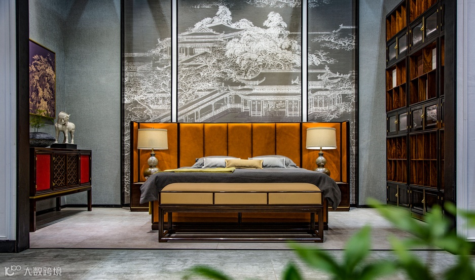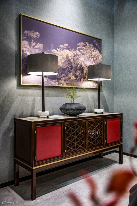 新中式家具在对材料装饰的运用上变得更加多元大胆,比传统古典家具的装饰运用提升了不少,这里包括台面装饰、布艺装饰、铜件装饰、玻璃装饰、灯光装饰等。