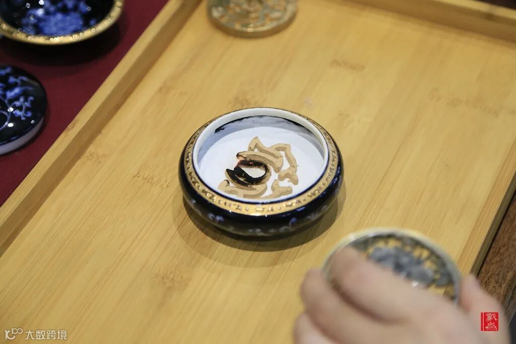 在香盘加热后,香粉的香气会逐渐散发出来。这时可以双手将香炉托起品香,感受香料的香气。