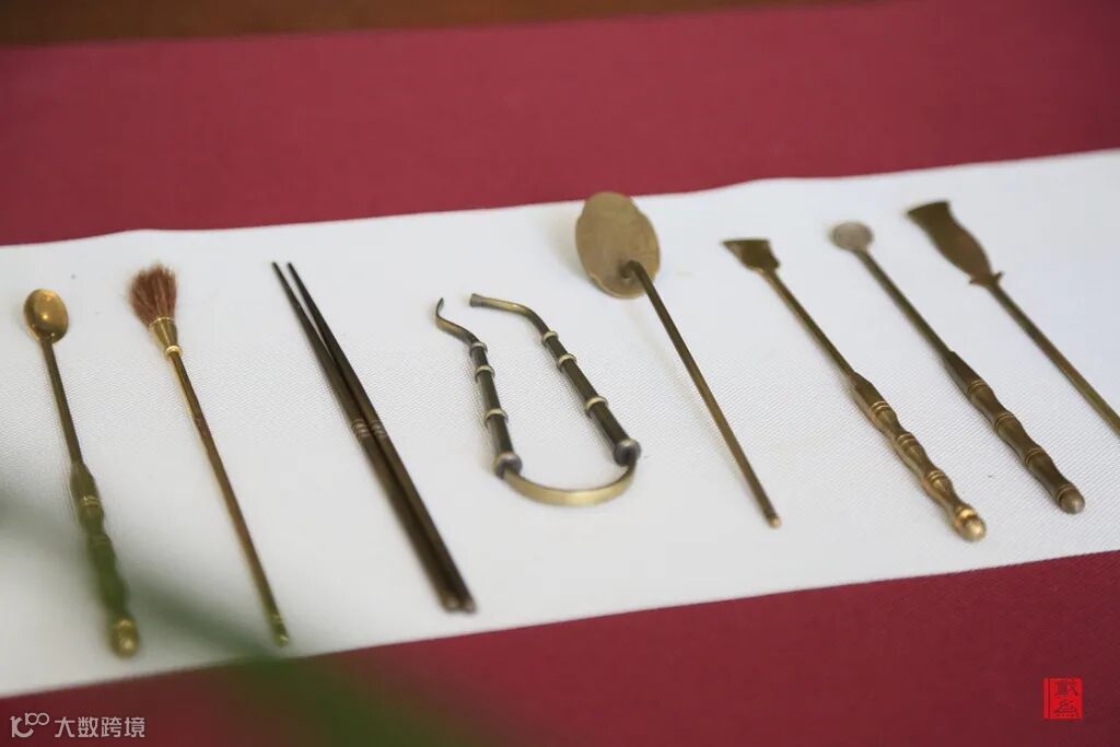 香道演绎,需要选择一个环境偏雅之处,备好专用打火机、香箸、香匙、香铲、香压、香扫、香碳、香篆模、香粉等香道用具。