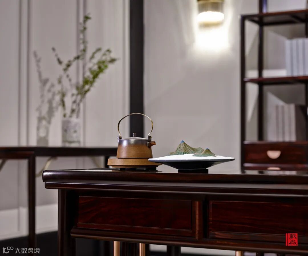 宽大的台面可以放置山水诗词、书香画意,以书籍晕染这个墨香空间。更甚,楚之骚,汉之赋,唐之诗,宋之词,元之曲皆可以分类存放在开放式书架上。