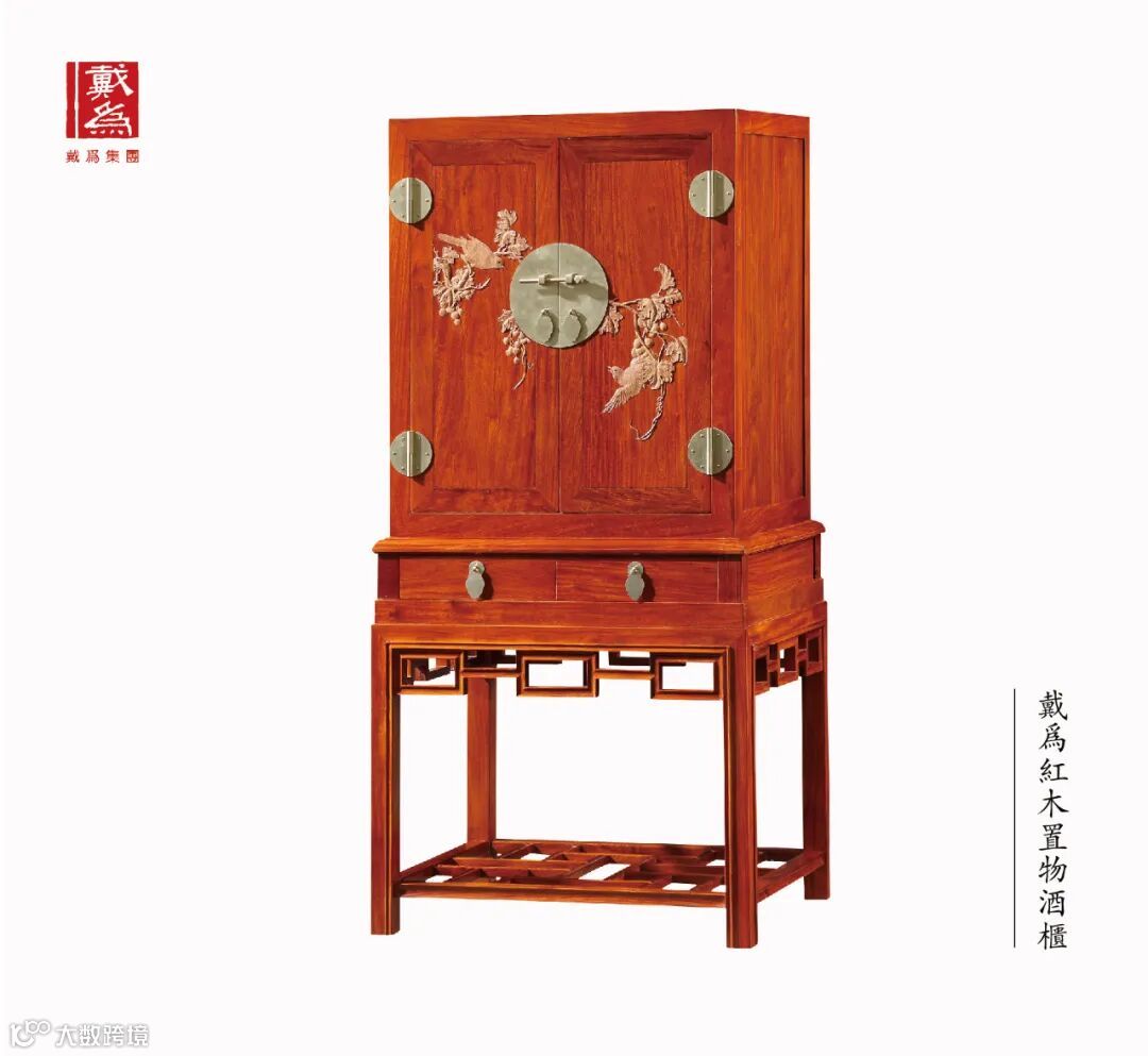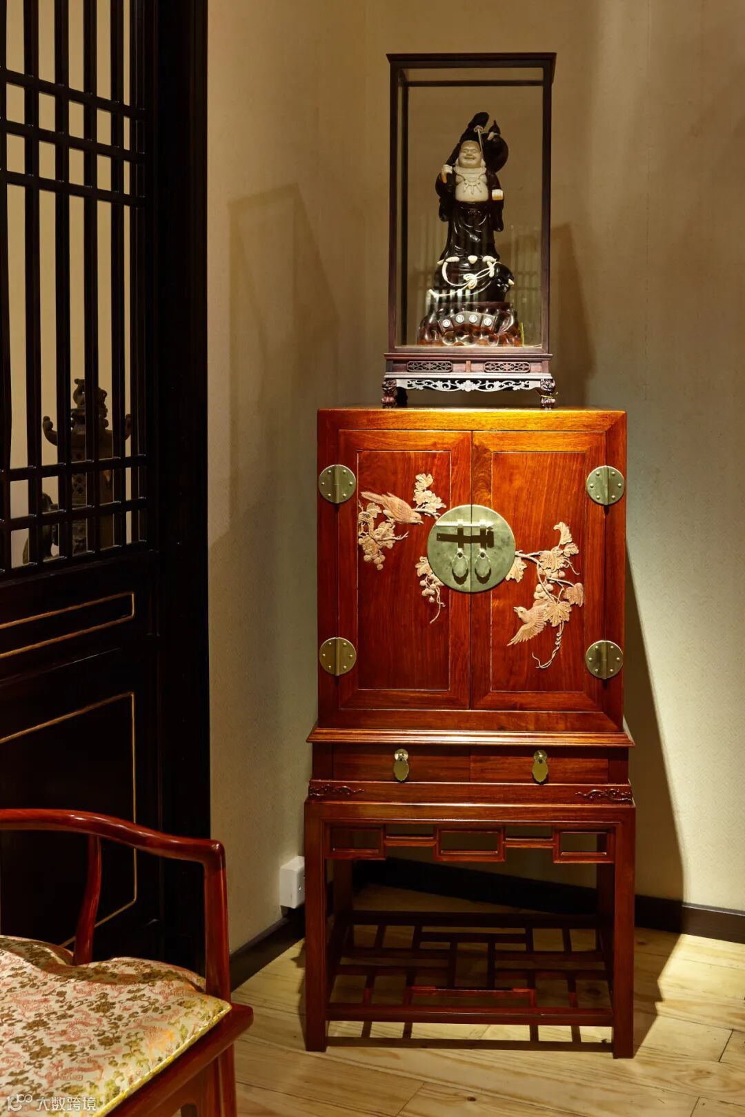 这件酒柜惹眼的地方在于明式家具的简约线条结构表现和工于檀雕花鸟的工艺精致完美地融合。