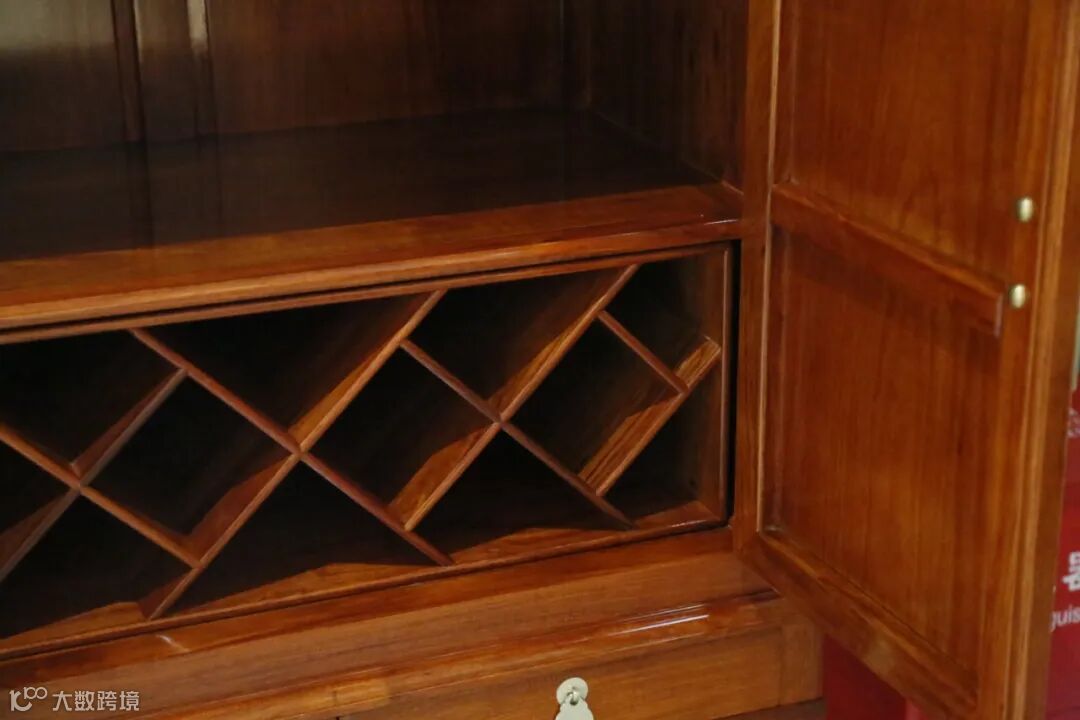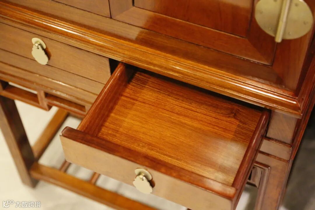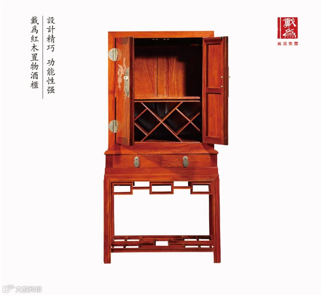 这是一件花梨红木(大果紫檀)为基材的置物酒柜,整体设计简约别致,没有多余的棱角,乍眼一看干净、舒适,精巧的外观让每一个空间都能有它的容身之处。
